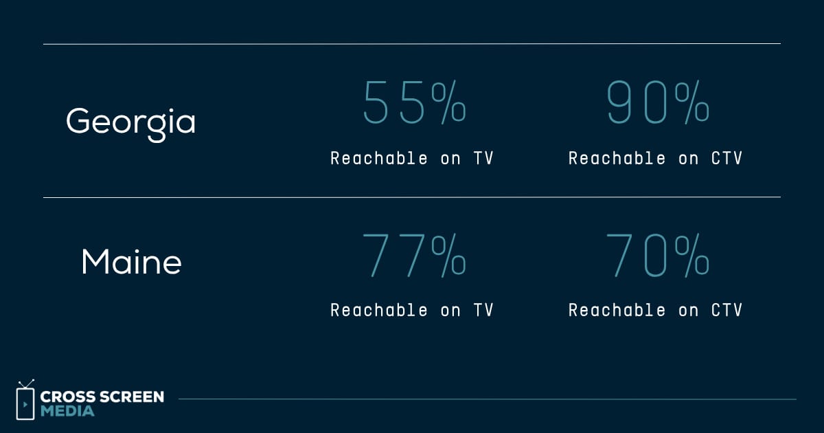The Cook Political Report shows both Georgia and Maine to be toss-ups and potential party flips. Their persuadable voters couldn’t be more different in terms of viewership.